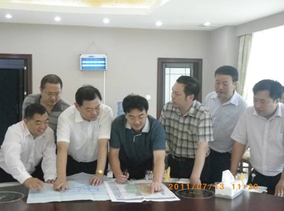圖二 黃市長(zhǎng)和市國(guó)土資源局劉炎發(fā)局長(zhǎng)(右二)、市城鄉(xiāng)規(guī)劃局熊局長(zhǎng)(右四)