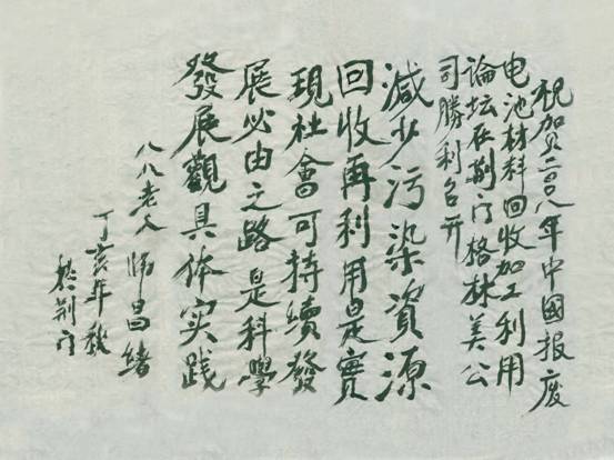 師院士曾于2008年10月15日至17日在荊門舉行的報廢電池材料回收加工利用論壇期間考察格林美荊門產(chǎn)業(yè)園,在公司董事長許開華教授陪同下參觀了格林美循環(huán)實驗室、電池解剖車間、生產(chǎn)車間及分析檢測中心,對格林美在廢舊電池材料的回收加工利用方面所取得的成績給予了充分肯定。并專門為格林美題詞:“祝賀二00八年中國報廢電池材料回收利用論壇在荊門格林美公司勝利召開!減少污染,資源回收再利用是實現(xiàn)社會可持續(xù)發(fā)展必由之路,是科學(xué)發(fā)展觀具體實踐 ”, 在師老榮獲國家最高科學(xué)技術(shù)獎勵之際,重溫師老的親筆題詞,更加深切感受到師老對格林美公司循環(huán)產(chǎn)業(yè)發(fā)展的充分肯定,必將極大鼓舞全體格林美人再接再厲,繼續(xù)在循環(huán)產(chǎn)業(yè)的自主創(chuàng)新、跨越發(fā)展的道路上創(chuàng)造新的輝煌!