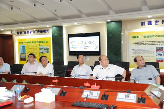 圖一 萬(wàn)勇市長(zhǎng)(左二)一行在格林美董事長(zhǎng)許開(kāi)華(左一)的陪同下參觀格林美電子監(jiān)控系統(tǒng)