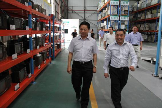 圖2. 國家發(fā)改委體改司孔涇源司長(前左一)一行在董事長許開華教授陪同下參觀格林美電子廢棄物倉庫