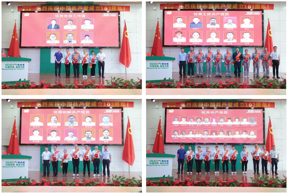 隨后,集團(tuán)黨委副書記王敏同志宣讀集團(tuán)黨委關(guān)于“七一”表彰的決定,大會(huì)授予格林美荊門園區(qū)材料制造中心黨支部、格林美鎳鈷鎢廢物再生與新材料研究院黨支部、格林美武漢園區(qū)黨支部、格林美印尼項(xiàng)目部海外黨支部等4個(gè)黨支部2023年度“優(yōu)秀黨支部”榮譽(yù)稱號(hào);授予何陽、胡意等6名同志2023年度“優(yōu)秀黨務(wù)工作者”榮譽(yù)稱號(hào);授予余小強(qiáng)、吳曉峰等10名同志2023年度“優(yōu)秀工匠共產(chǎn)黨員”榮譽(yù)稱號(hào);授予李玉華、許鵬云等10名同志2023年度“優(yōu)秀創(chuàng)新共產(chǎn)黨員”榮譽(yù)稱號(hào);授予穆猛剛、彭亞光、徐兆博等22名同志2023年度“優(yōu)秀共產(chǎn)黨員” 榮譽(yù)稱號(hào)。大會(huì)為受表彰的4個(gè)組織及48名先進(jìn)個(gè)人頒獎(jiǎng)。