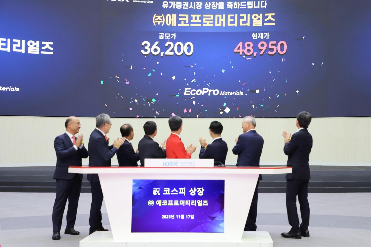2023年11月17日上午,格林美參股公司韓國EcoPro Materials CO., LTD.(以下簡稱“EcoPro Materials”)成功在汝矣島韓國交易所主板掛牌上市,成為韓國資本市場新能源板塊的第一家前驅(qū)體材料上市公司。格林美集團(tuán)董事長許開華教授受邀出席上市儀式。EcoPro Materials(股票代碼:450080)本次公開發(fā)行新股11,580,800股,發(fā)行價(jià)格為36,200韓元/股。格林美持有其2,022,074股股票,占其發(fā)行后總股本的3.00%。