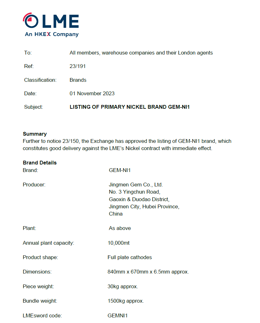 格林美電積鎳品牌GEM-NI1成功注冊(cè)于倫敦金屬交易所
