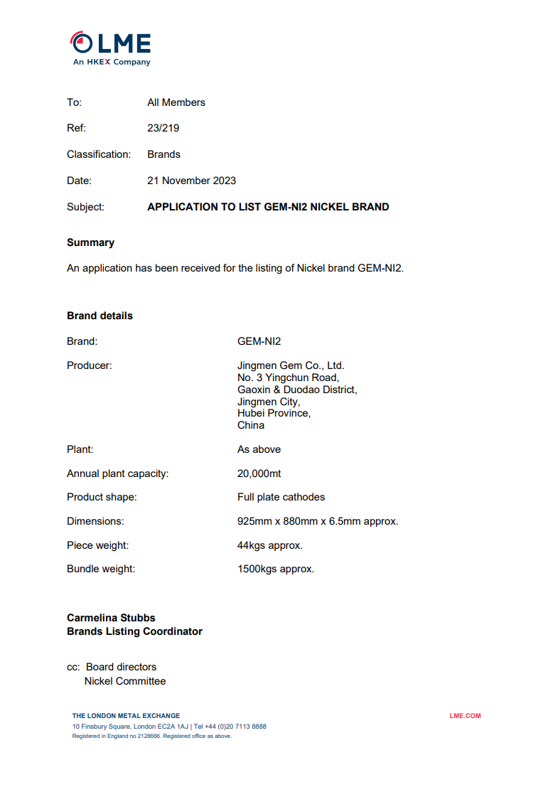 格林美電積鎳品牌GEM-NI2成功注冊(cè)于倫敦金屬交易所