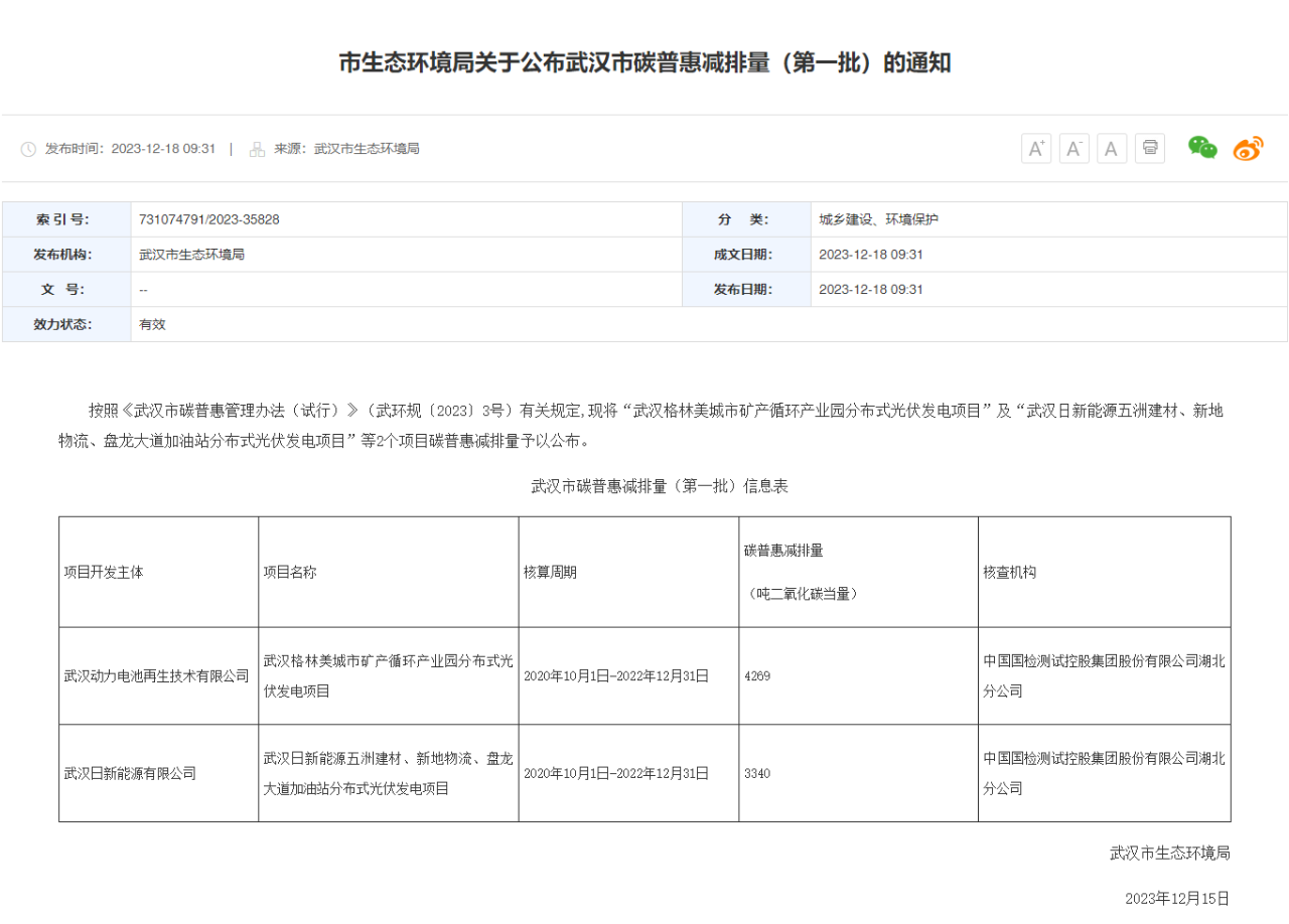 2023年12月18日,武漢碳普惠登記平臺(tái)登記了經(jīng)武漢市生態(tài)環(huán)境局發(fā)布的首批(僅有2家單位)碳普惠減排量項(xiàng)目,共計(jì)減排7609噸,其中格林美集團(tuán)申報(bào)的“武漢格林美城市礦產(chǎn)循環(huán)產(chǎn)業(yè)園分布式光伏發(fā)電項(xiàng)目”獲批簽發(fā)登記碳普惠...