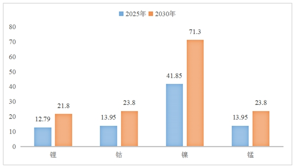 2025/2030年全球新能源汽車鋰、鈷、鎳、錳需求量預測(萬噸)
