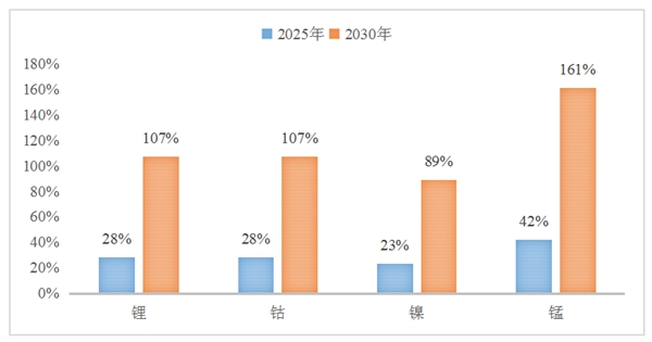 根據(jù)全球新能源汽車銷售預測分析,2025年全球累計退役動力電池將達281萬噸(約327GWh),而通過回收全球動力電池可再生的鋰、鈷、鎳、錳資源量分別約占當年需求量的28%、28%、23%、42%;2030年全球累計退役動力電池將達2029萬噸(約2123GWh),通過回收全球動力電池可再生的鋰、鈷、鎳、錳資源量分別約占當年需求量的107%、107%、89%、161%。