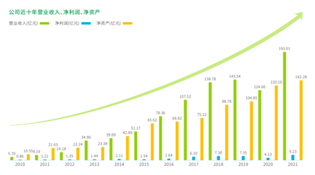 2021年,格林美各項(xiàng)業(yè)務(wù)產(chǎn)能大釋放,經(jīng)營(yíng)效益大增長(zhǎng),營(yíng)業(yè)收入193.01億元,同比增長(zhǎng)54.83%;凈利潤(rùn)9.23億元,同比增長(zhǎng)123.82%。格林美自2010年上市以來(lái),持續(xù)快速增長(zhǎng),業(yè)績(jī)一路飆升,營(yíng)業(yè)收入提升近34倍,凈利潤(rùn)提升近11倍,凈資產(chǎn)提升超13倍,成功塑造了一個(gè)世界低碳循環(huán)產(chǎn)業(yè)傳奇。
