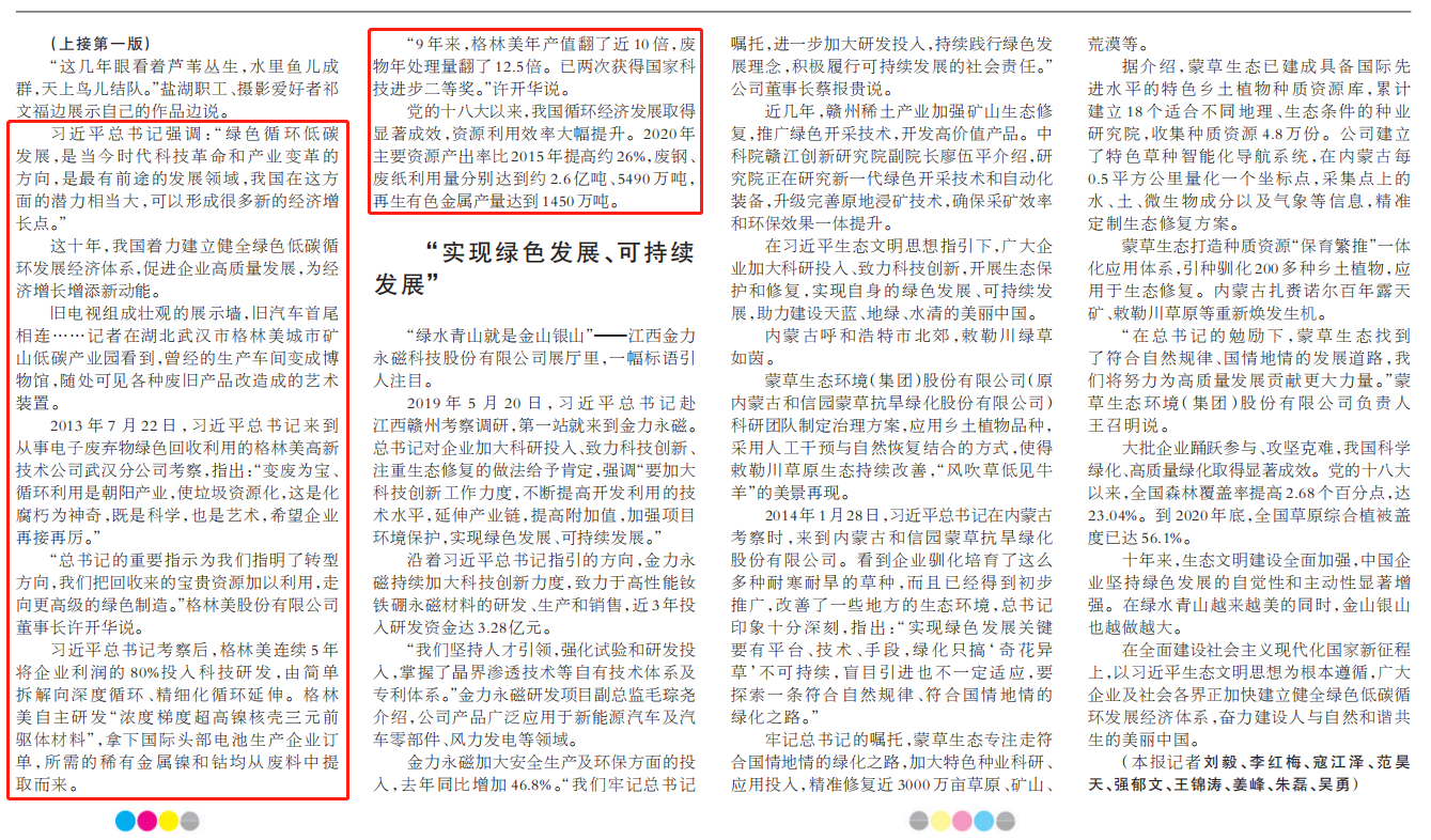 8月22日,《人民日?qǐng)?bào)》頭版頭條刊發(fā)報(bào)道《改善生態(tài)環(huán)境就是發(fā)展生產(chǎn)力(這十年,總書記這樣勉勵(lì)企業(yè)高質(zhì)量發(fā)展)》,肯定了企業(yè)在貫徹新發(fā)展理念,實(shí)現(xiàn)綠色發(fā)展、可持續(xù)發(fā)展方面作出的重要貢獻(xiàn)。其中,格林美作為中國生態(tài)環(huán)境保護(hù)事業(yè)和中國綠色低碳循環(huán)經(jīng)濟(jì)高質(zhì)量發(fā)展的典型代表,再獲《人民日?qǐng)?bào)》點(diǎn)贊,這是今年以來《人民日?qǐng)?bào)》第二次在頭版頭條專題報(bào)道中點(diǎn)贊格林美。文中提到: