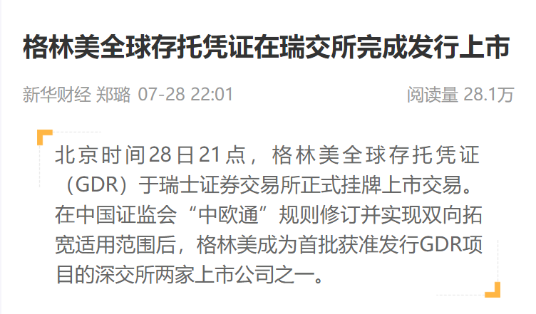 7月28日,新華社·新華財(cái)經(jīng)欄目發(fā)布文章《格林美全球存托憑證在瑞交所完成發(fā)行上市》。