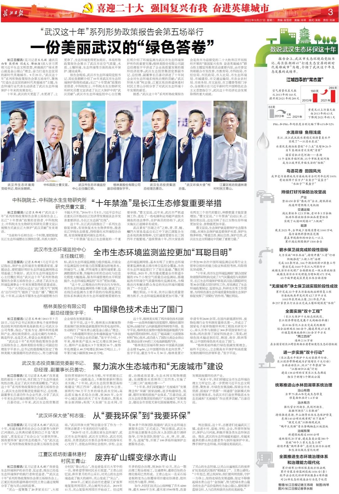 2022年9月27日,《長(zhǎng)江日?qǐng)?bào)》刊發(fā)“喜迎二十大 強(qiáng)國(guó)復(fù)興有我 奮進(jìn)英雄城市”專(zhuān)欄,專(zhuān)題報(bào)道“武漢這十年”系列形勢(shì)政策報(bào)告會(huì)第五場(chǎng)——一份美麗武漢的“綠色答卷”。具體報(bào)道如下: