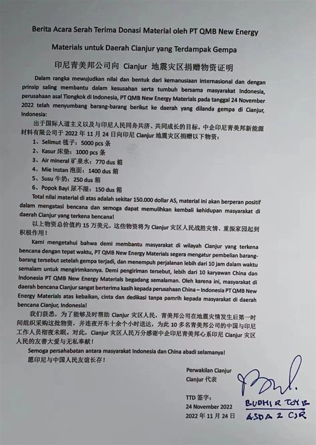 展玉災(zāi)區(qū)政府十分感謝中國企業(yè)青美邦的友善大愛與無私奉獻(xiàn),認(rèn)為這高度體現(xiàn)了印尼與中國人民之間的深厚友誼!