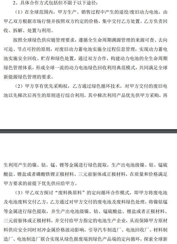 合作方式包括:在全球范圍內(nèi),嵐圖汽車生產(chǎn)、銷售過程中產(chǎn)生的退役/廢舊動力電池,由雙方根據(jù)市場行情并按照雙方約定的價格,集中交付格林美處置。格林美負責(zé)回收、拆解、處置與利用。格林美通過綠色循環(huán)技術(shù),對嵐圖汽車交付的廢舊電池以先梯次后再生的原則進行綜合利用,其中梯次利用產(chǎn)品優(yōu)先嵐圖汽車供采購,再生利用產(chǎn)生的鎳、鈷、錳、鋰等金屬進行綠色提取,生產(chǎn)出電池級鎳、鈷、錳硫酸鹽、鋰鹽或者磷酸鐵鋰正極材料、三元前驅(qū)體或正極材料,在質(zhì)量和價格滿足嵐圖汽車要求的前提下優(yōu)先供應(yīng)給嵐圖汽車。